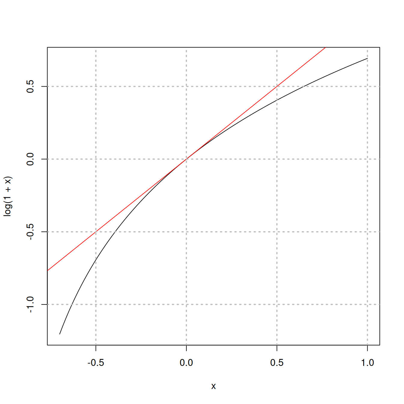 Arvio perustuu siihen, että \[ \log(1+\delta)\approx \delta, \] kun \(\delta\approx 0\). Tätä havainnollistaa seuraava kuvio, jossa funktiota \(y=\log(1+x)\) sivuaa suora \(y=x\). Vastaava approksimaatio eksponenttifunktiolle on \[ \exp(\delta)\approx 1+\delta. \]